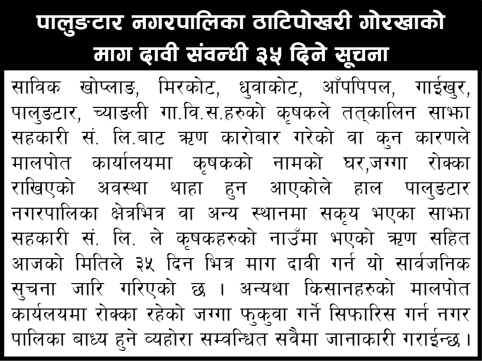 पालुङटार नगरपालिका ठाटीपोखरी गोरखाको माग दाबी सम्बन्धी ३५ दिने सूचना