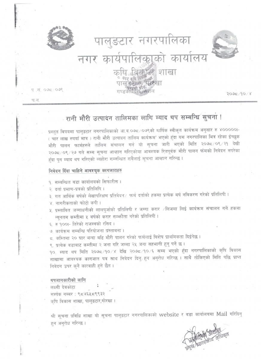 रानी माैरी उत्पादन तालिमका लागि म्याद थप सम्बन्धि सुचना ।
