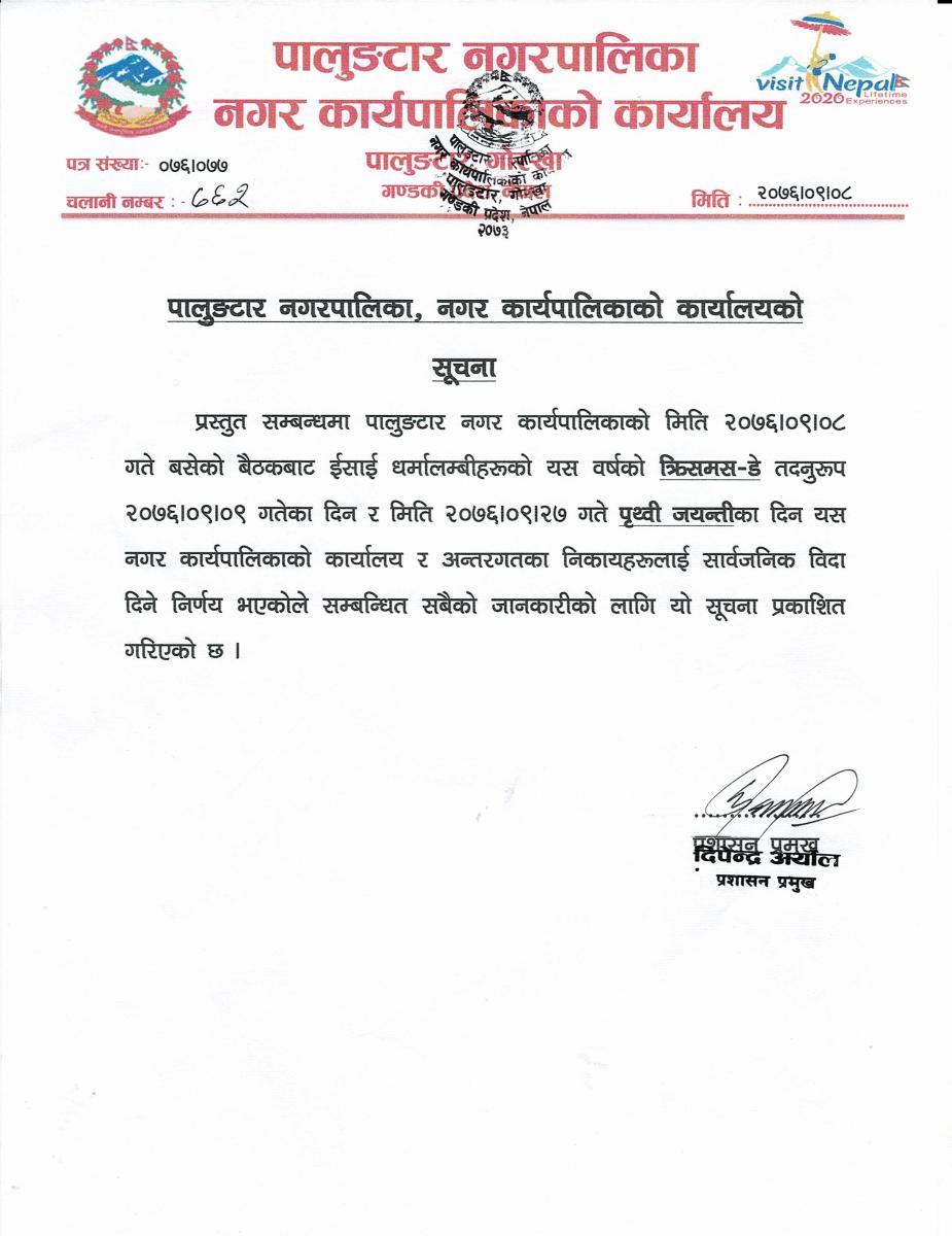 पालुङटार नगरकार्यपालिकाको बिदा सम्बन्धि सूचना