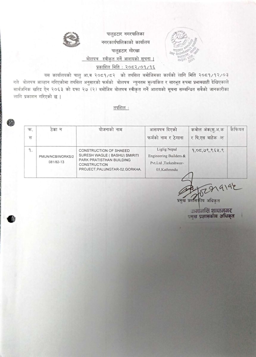 बोलपत्र स्वीकृत गर्ने आशयको सूचना