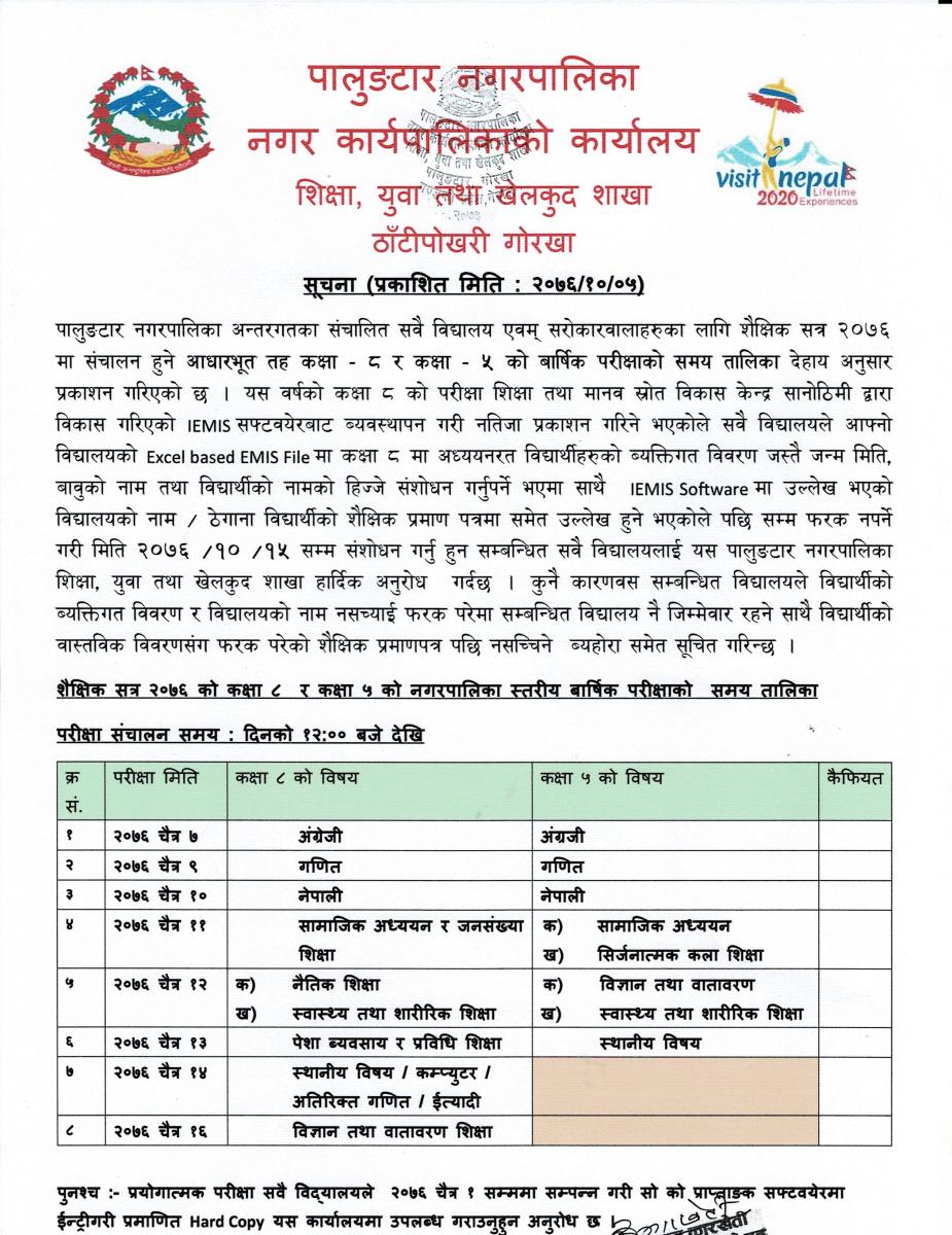शैक्षिक सत्र २०७६ को कक्षा ८ र कक्षा ५ को नगरपालिका स्तरीय वार्षिक परिक्षाको सूचना