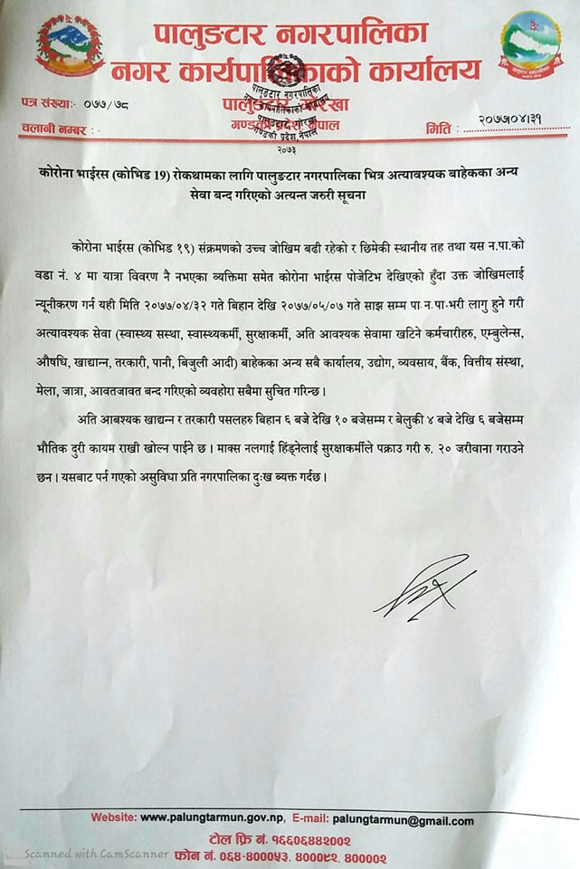 पालुङटार नगरपालिकाको अति आवश्यक बाहेकका अन्य सेवा बन्द गरिएको अत्यन्त जरुरी सूचना