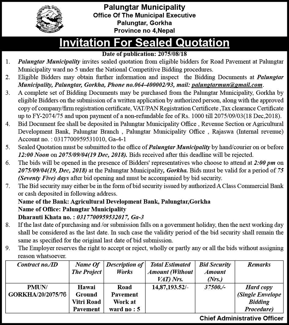 पालुङ्गटार नगरपालिका, पालुङ्गटार नगरपालिका वार्ड नं ५ को पक्कि सडकको गोप्य शिलबन्दी बोलपत्र आव्हावन गर्दछ