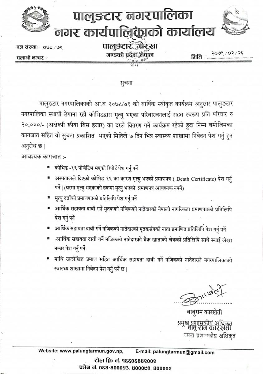 कोभिड १९ बाट मृत्यु भएका परिवारलाई राहत सम्बन्धि सूचना