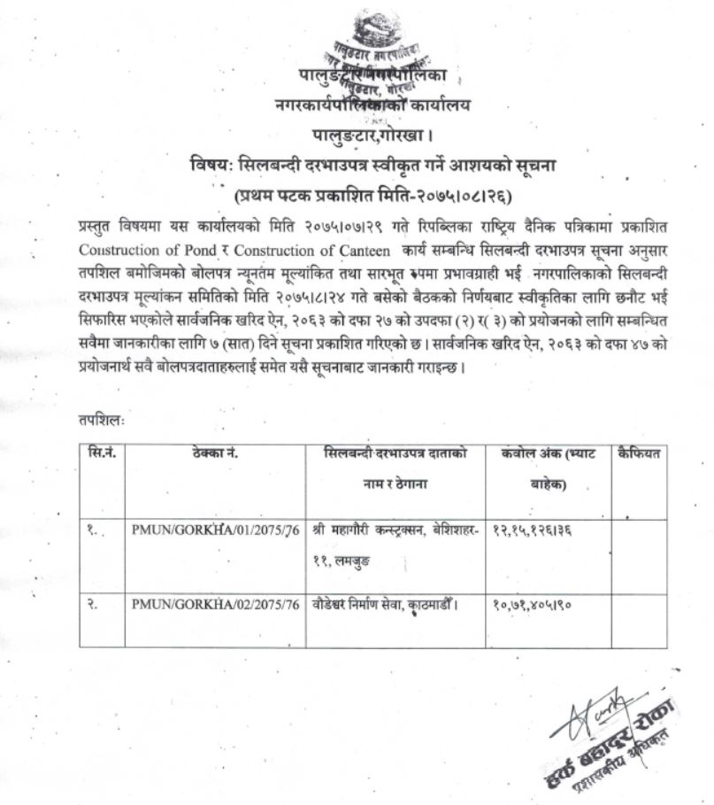 शिलबन्दी दरभाउपत्र स्वीकृत गर्ने आशयको सूचना