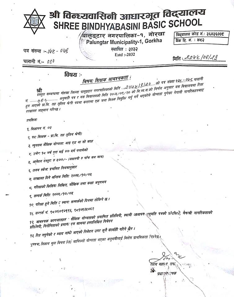 शिक्षक आवश्यकता - बिन्दबासिनीआधारभूत स्कुल