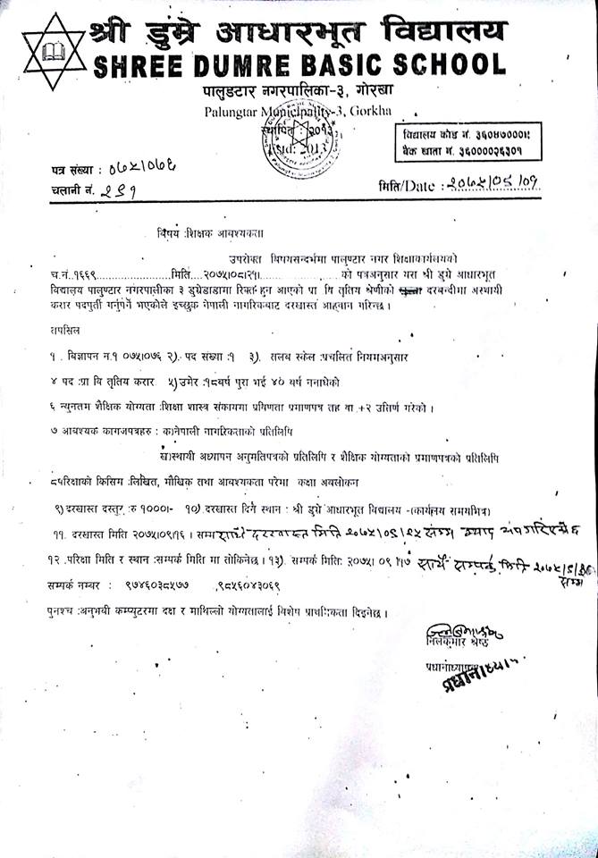 डुम्रे आधारभूत स्कूलमा शिक्षकको आवश्यकता