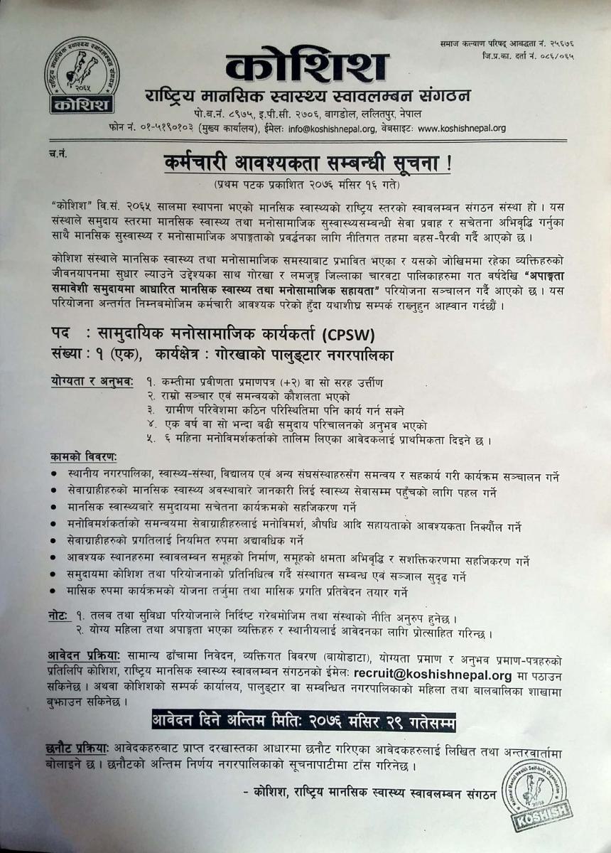 कोशिश संस्थामा कर्मचारी आवश्यकता सम्बन्धि सूचना